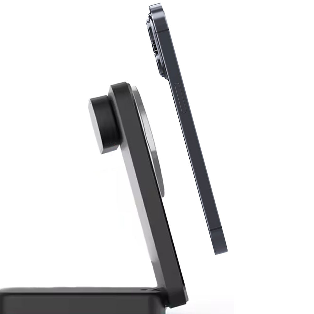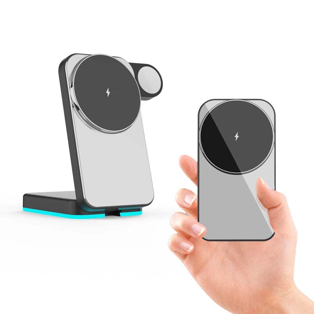 • The LumaSpin 3-in-1 Foldable Wireless Charger blends innovation with convenience, allowing you to charge your iPhone (15W), AirPods (5W), and Apple Watch (3W) all at once. Its sleek glass design is both stylish and portable perfect for avoiding low battery anxiety wherever you go. Featuring a 180° rotating stand, it supports both vertical and horizontal charging, making it ideal for streaming shows or live broadcasts. The strong magnetic alignment ensures your phone stays securely in place, even with cases up to 8mm thick. A built-in RGB ambient light adds a modern touch, while its compact foldable design makes it easy to pack for travel.