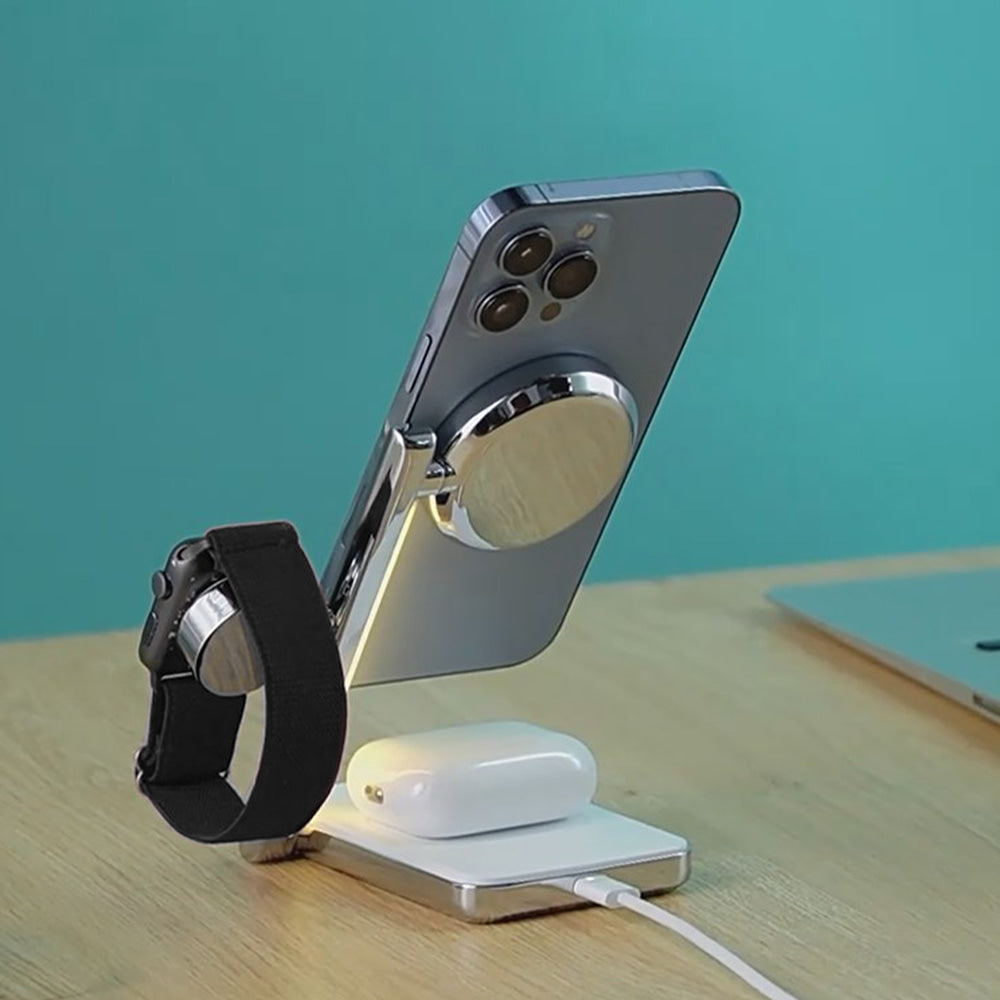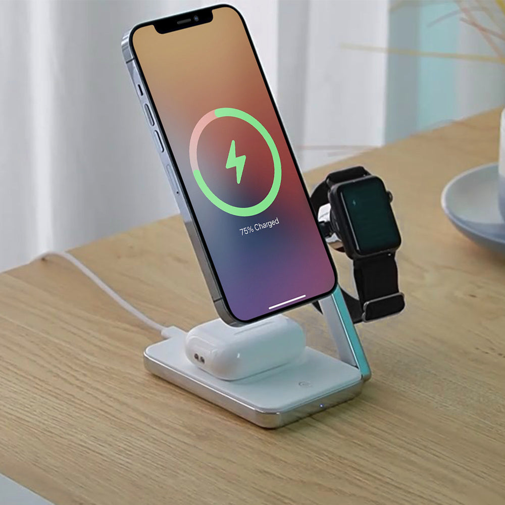 • EvoSync Trio 3-in-1 MagSafe Charger delivers fast wireless charging for your iPhone (up to 15W), Apple Watch (5W), and AirPods (5W) at the same time. The magnetic design ensures a secure snap-on connection, with MagSafe compatibility and support for Qi-enabled devices. The foldable, adjustable stand lets you switch between portrait and landscape modes with ease. Built-in safety features include temperature control, short-circuit protection, and a cooling system for reliable, worry-free charging.A non-slip weighted base keeps everything steady, while the compact form makes it easy to take on the go.