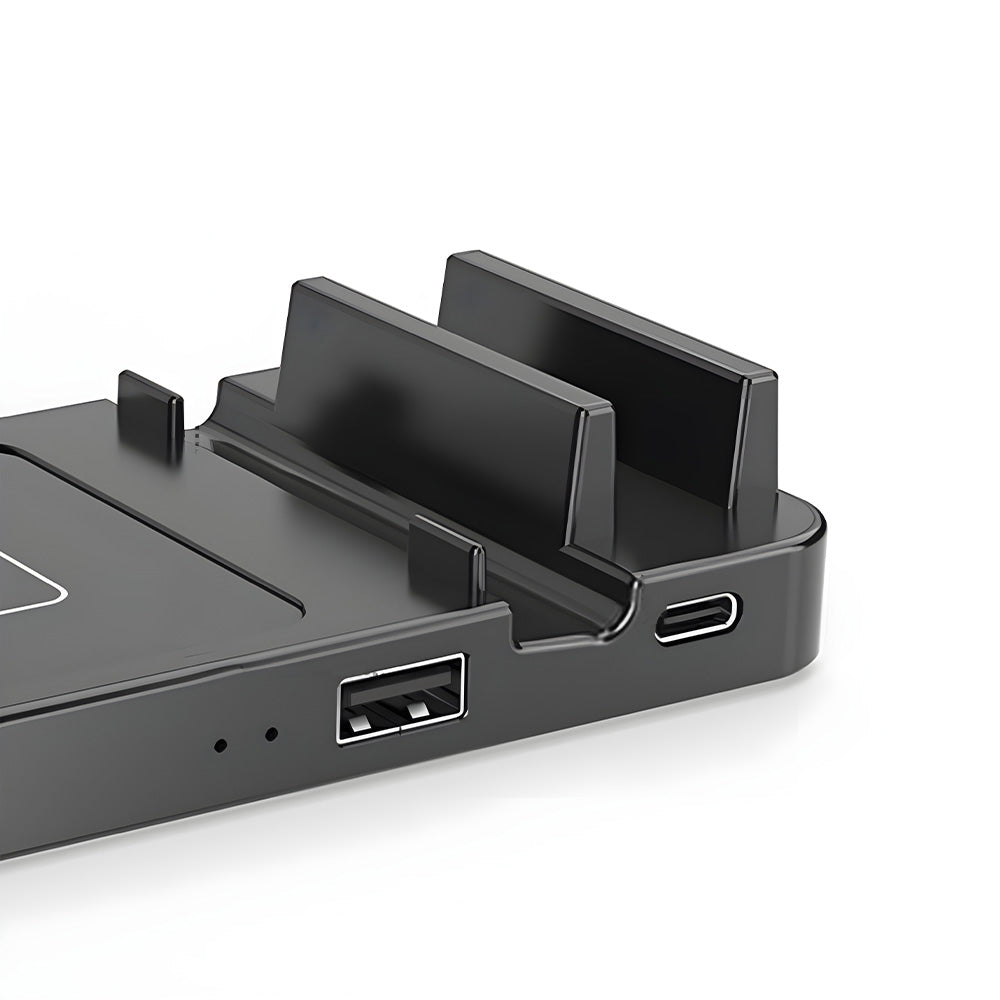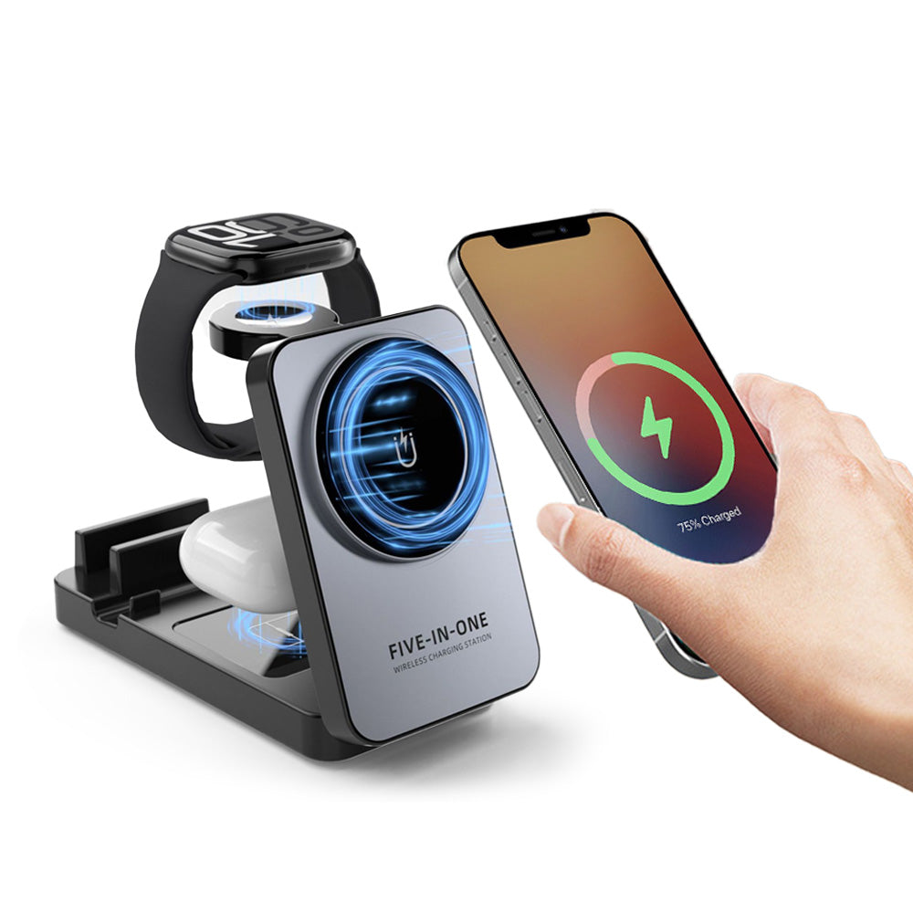 • The SnapDock 5-in-1 MagSafe Charging Station is a versatile and compact solution for all your charging needs. It supports simultaneous wireless charging for your iPhone, Apple Watch, and AirPods, along with USB and Type-C ports for wired devices. With intelligent power matching, automatic charging detection, and multiple safety protections (overcharge, overheating, short-circuit), it ensures fast, efficient, and safe charging. Its innovative foldable design makes it portable for travel or office use, while its eco-friendly materials align with sustainable practices. Reorganize your desk and keep all devices powered with this all-in-one charging hub.