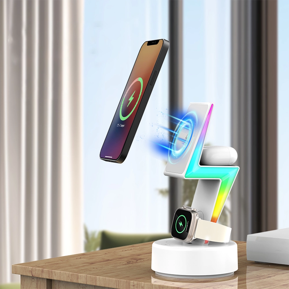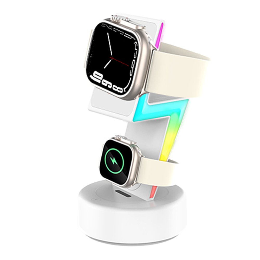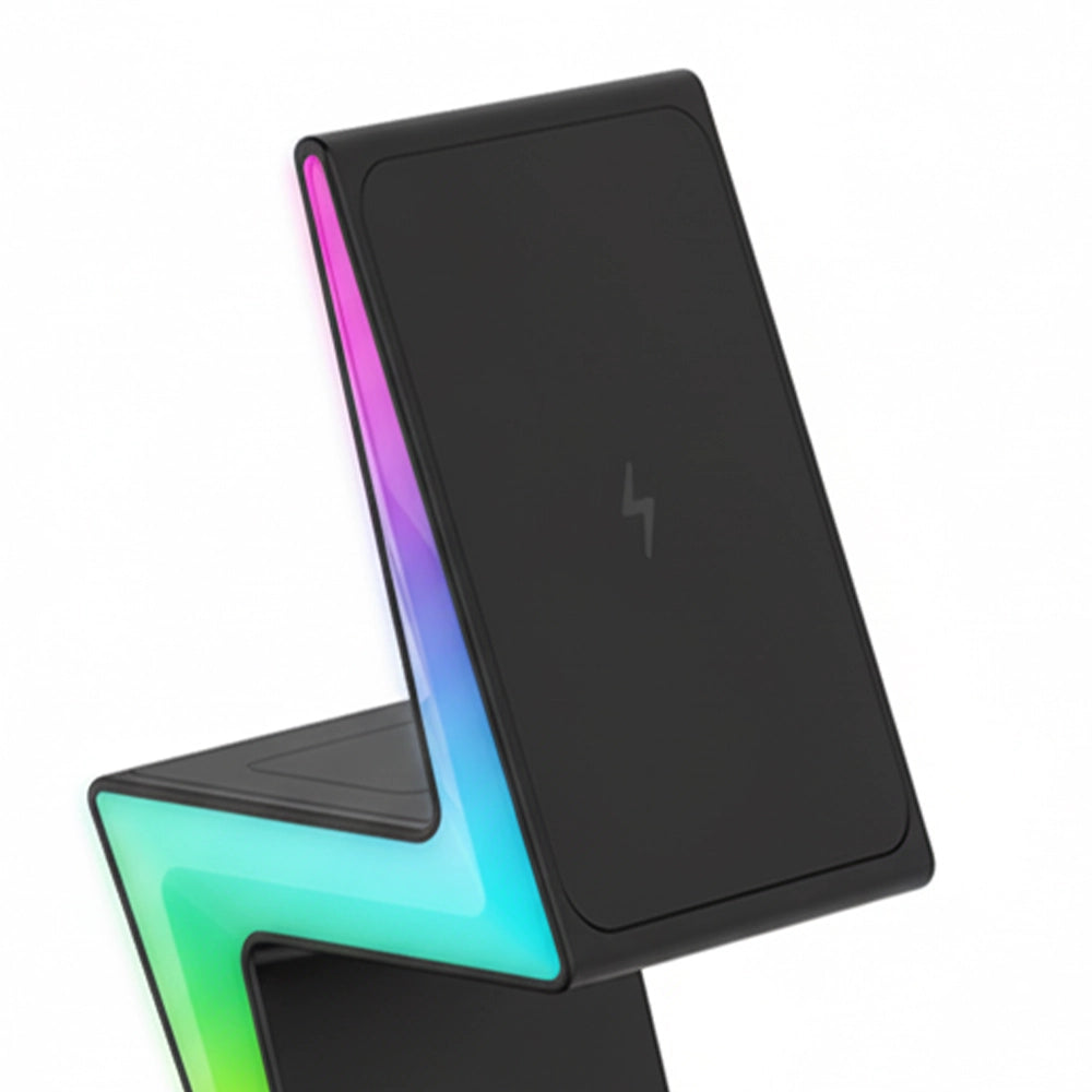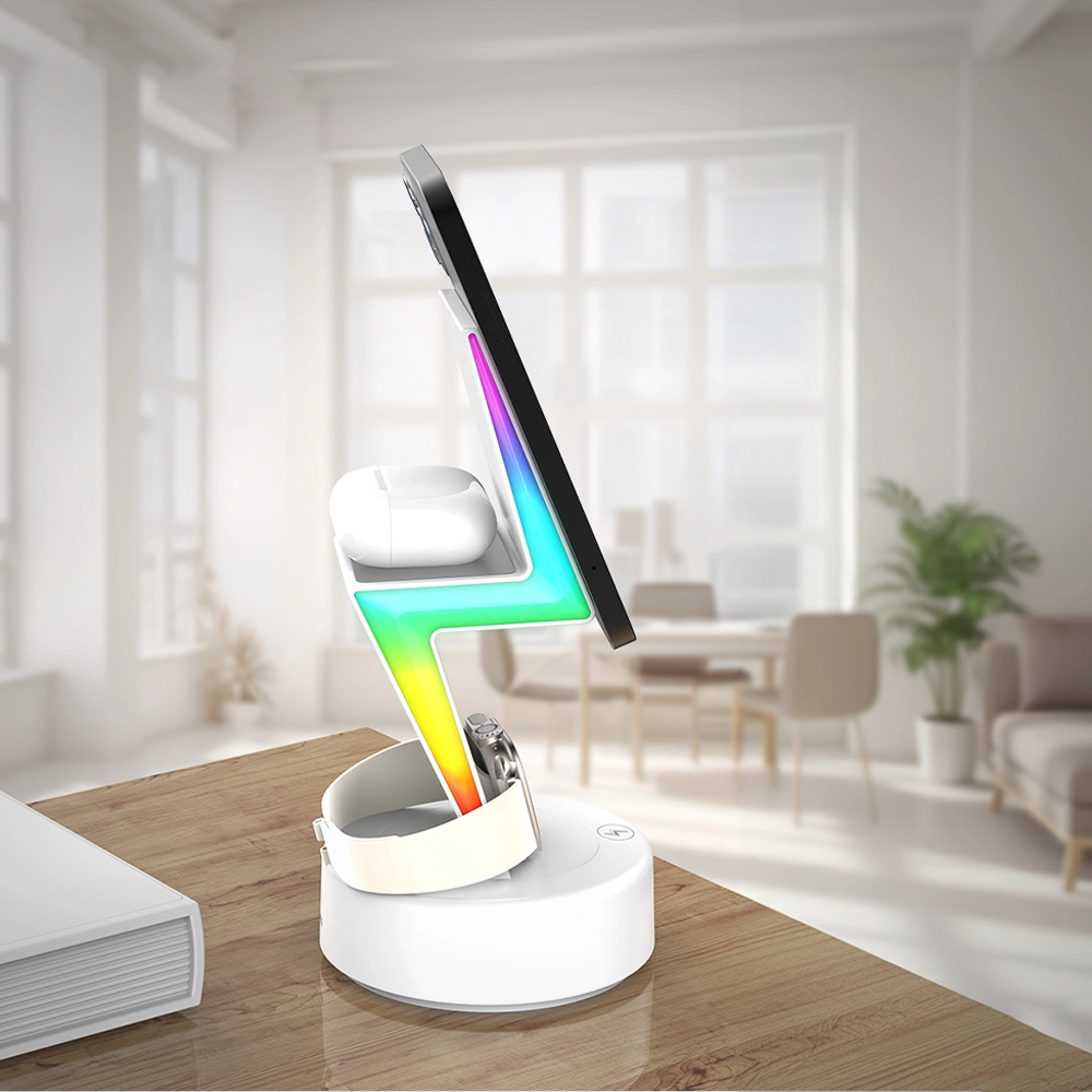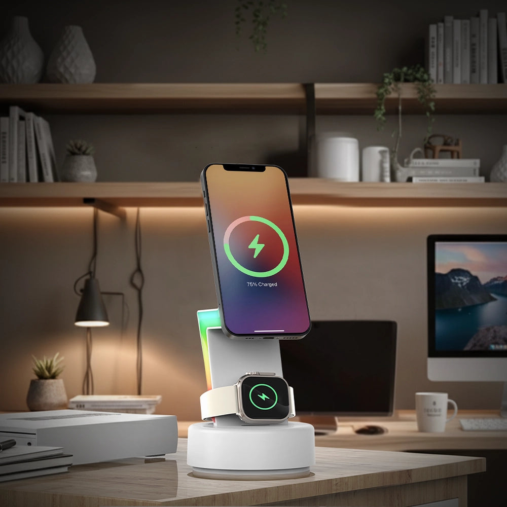 Designed for a seamless experience, the Volt Flux Trio features an ergonomic tilt for easy one-handed phone pickup and a wide watch charger that works with the strap on. It enhances your space with dynamic RGB running lights and soft warm lighting to create the perfect ambiance. Crafted from premium materials and including a versatile horizontal/vertical viewing stand.