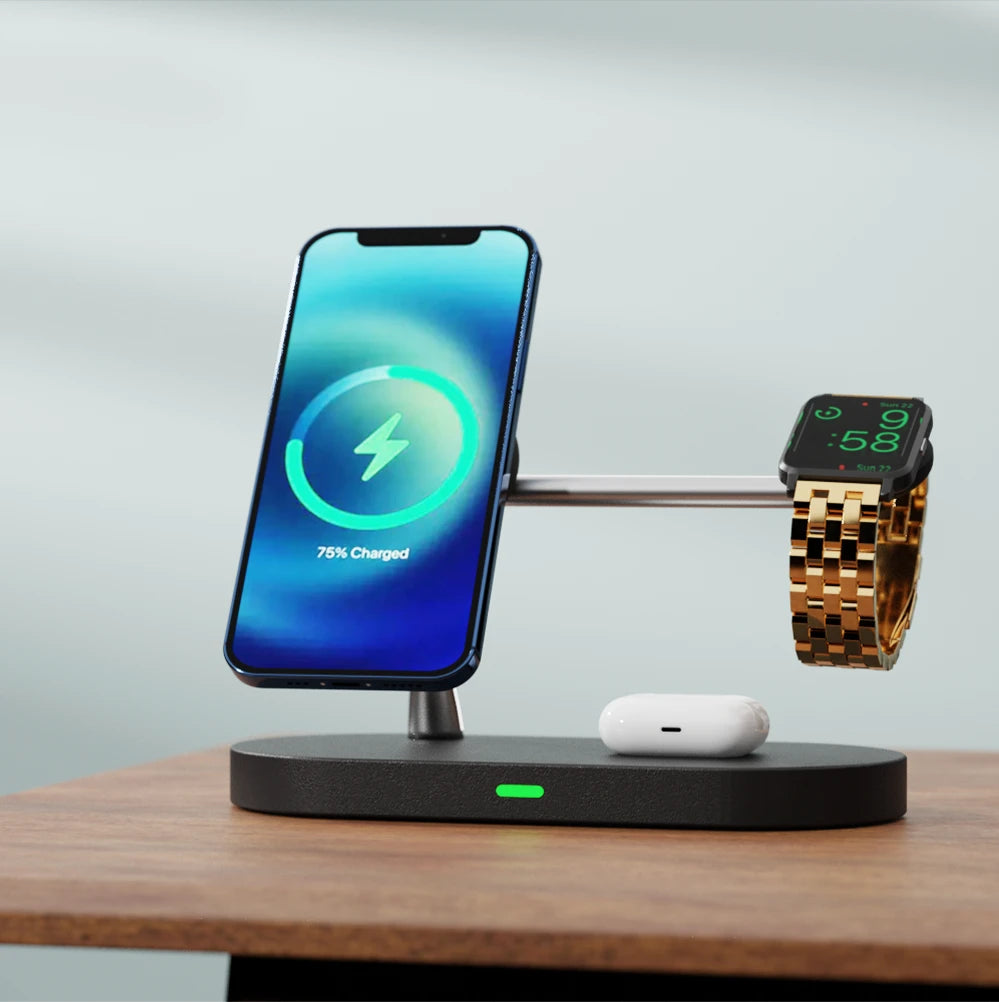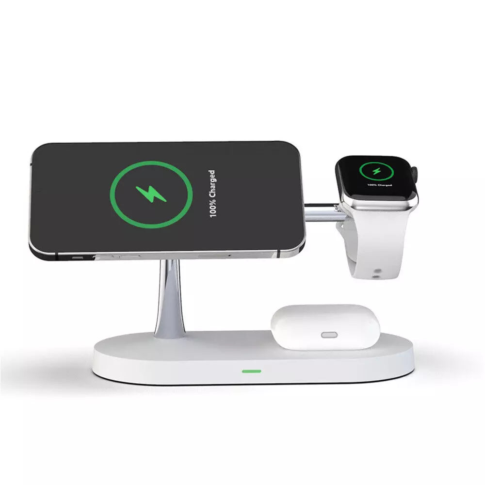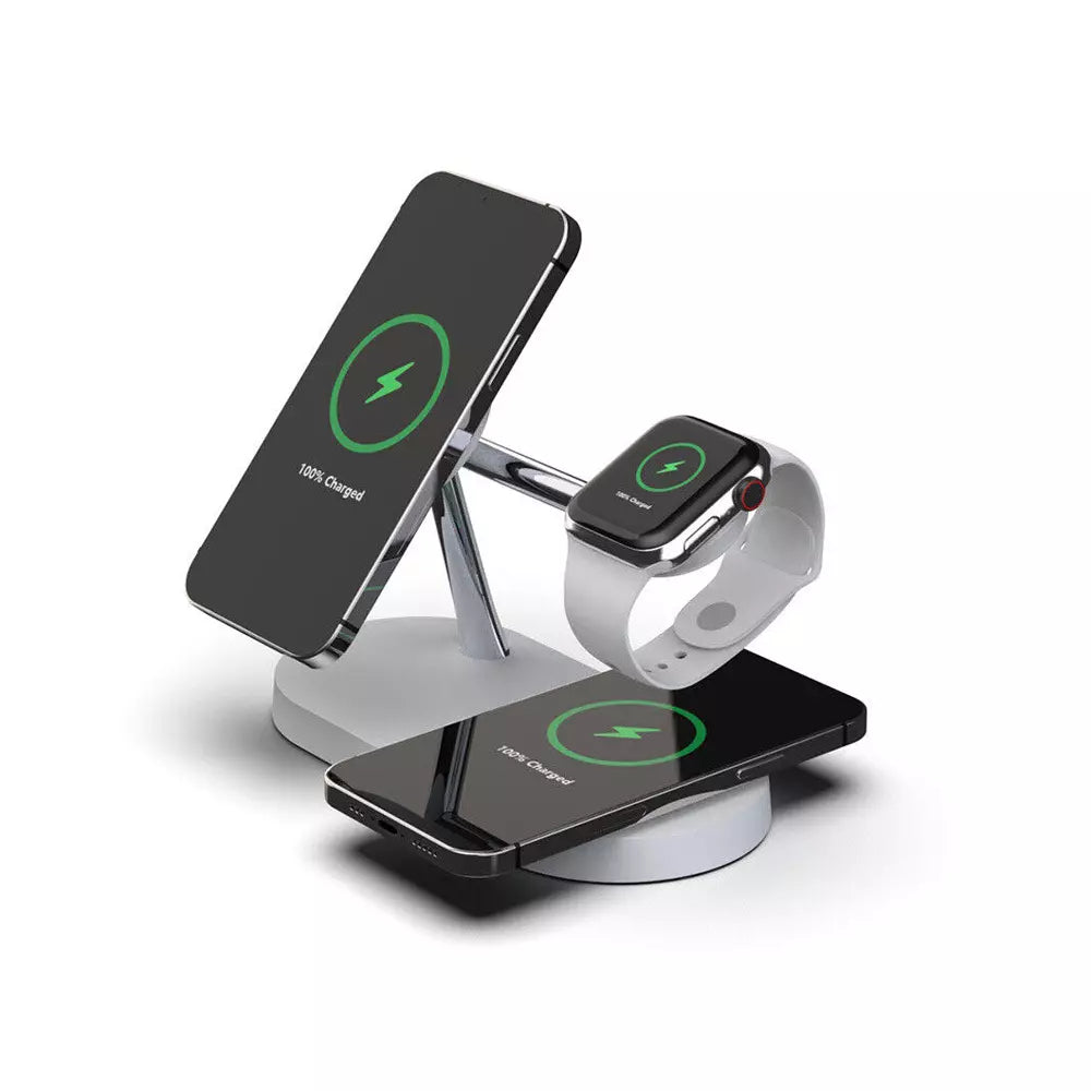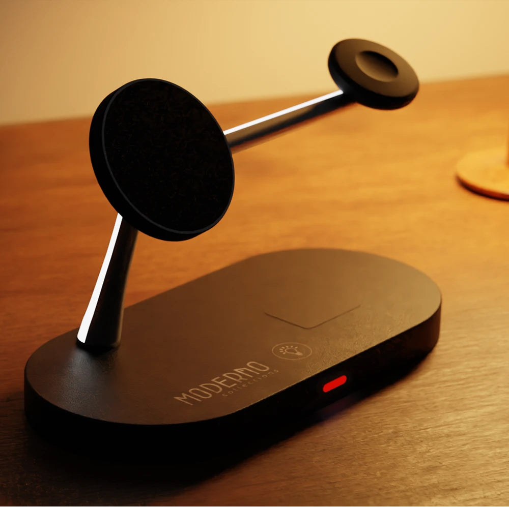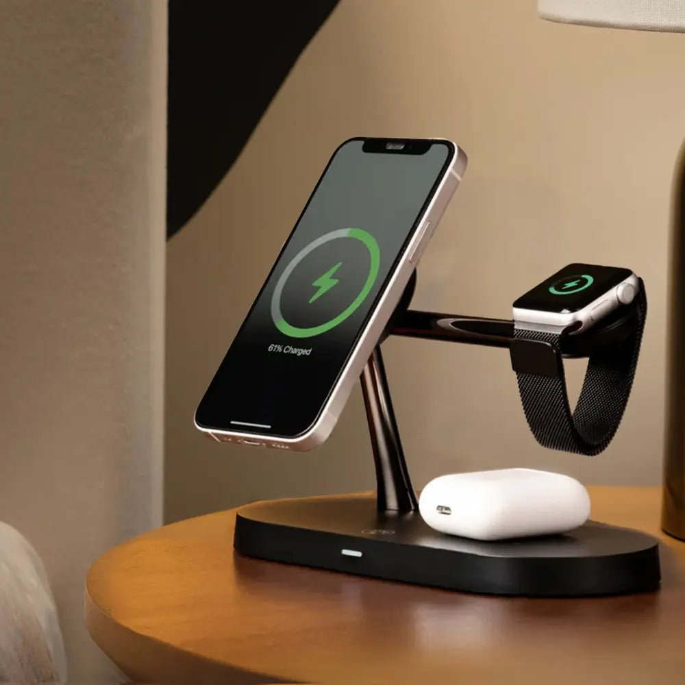Introducing the new Premium 3 in 1 MagSafe Fast Wireless Charging Stand with night light feature, designed to be the perfect nightstand wireless charger, integrates an intensity controlled night light and a MagSafe 3 in 1 charger. Charge any of your iPhone 15, 14, 13 & 12 series, Apple Watch, and AirPods batteries simultaneously quickly.