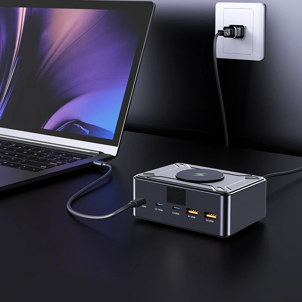 Six ports, wireless charging, and 190W of smart power distribution charge your laptop, tablet, phone, and more all at once without slowing down.