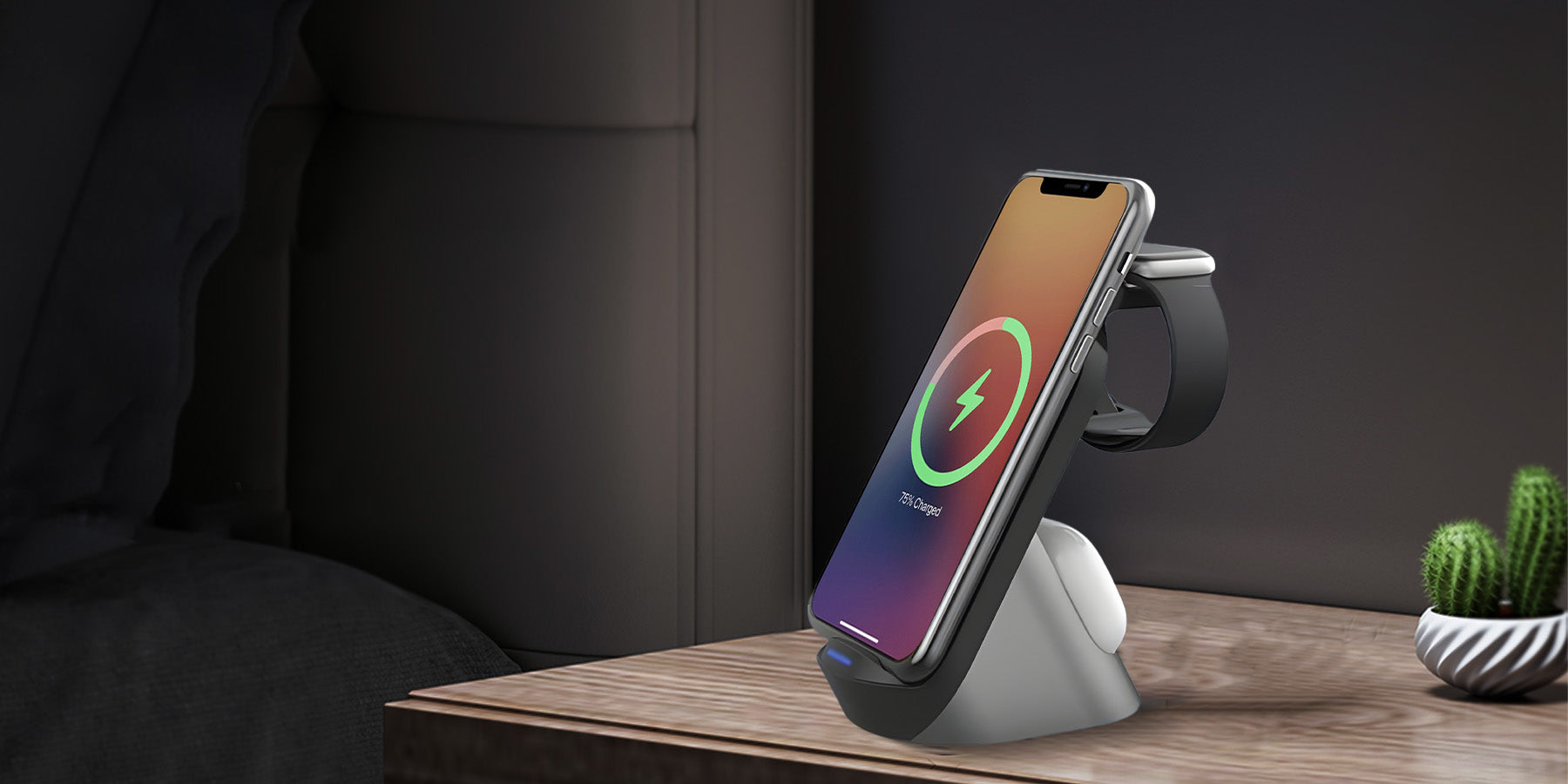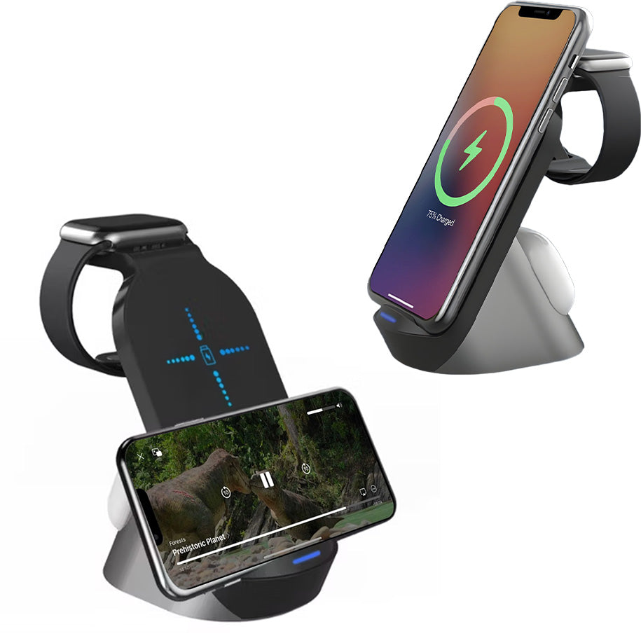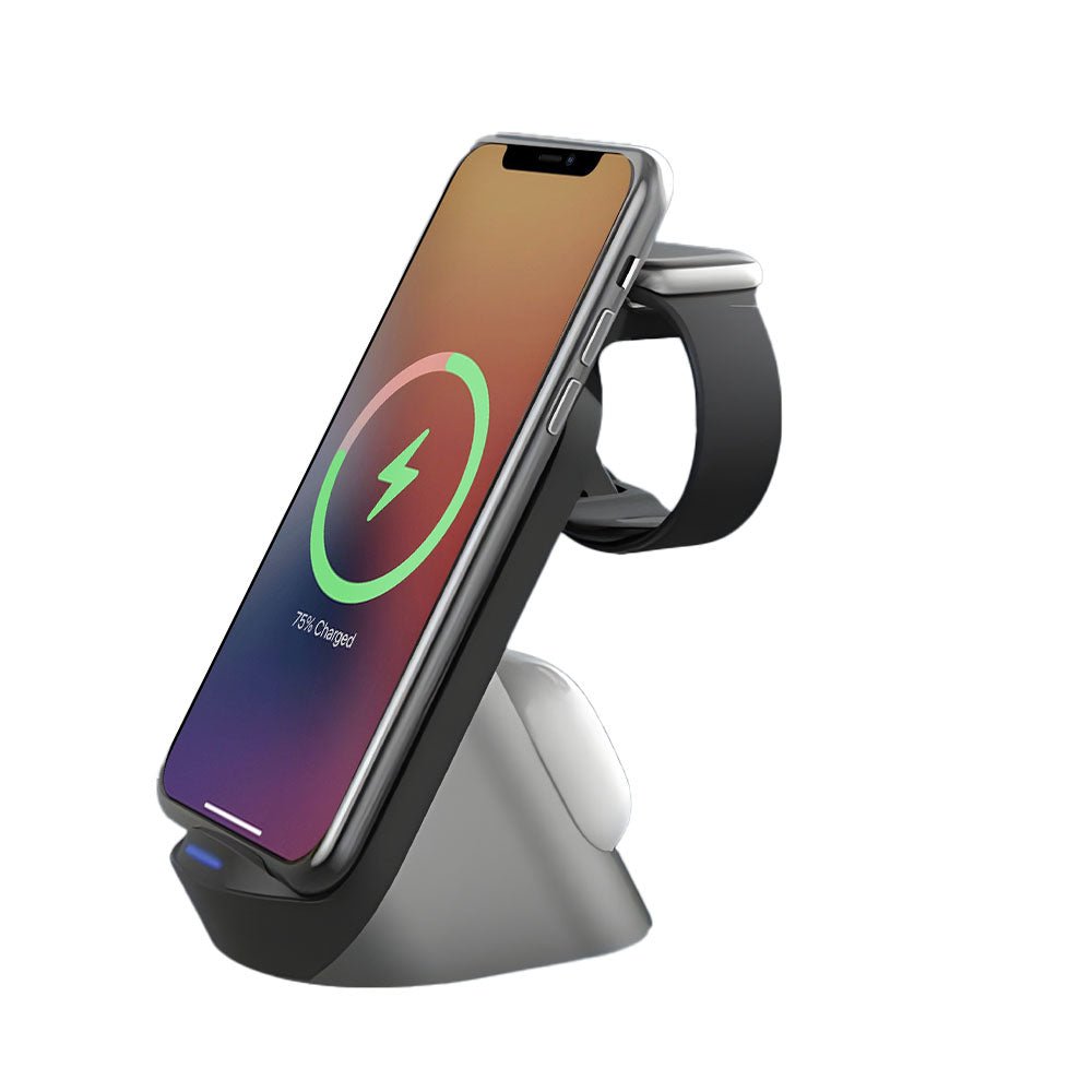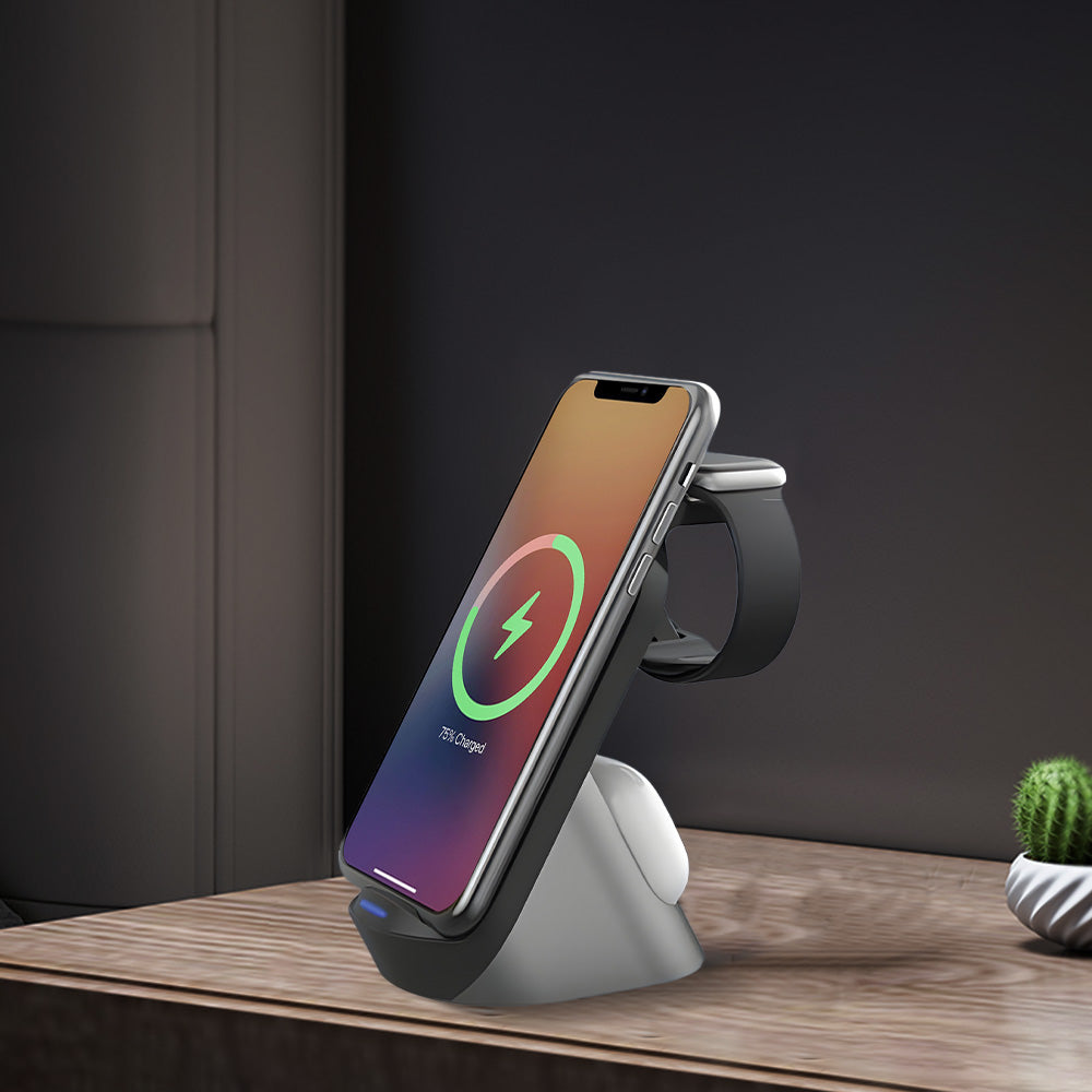 • This elegant charging station powers your iPhone, Apple Watch, and AirPods simultaneously all without the clutter of cables. With MagSafe alignment and dual-coil 15W fast charging, just drop your device on the pad for instant, secure charging even with the case on. Engineered with intelligent current matching, the iNest adapts power output to each device to maintain battery health. Its auto power-off feature prevents overcharging, switching to protection mode when your devices are fully charged. Charge in portrait or landscape mode while you stream, scroll, or video call, and stay safe with smart foreign object detection.