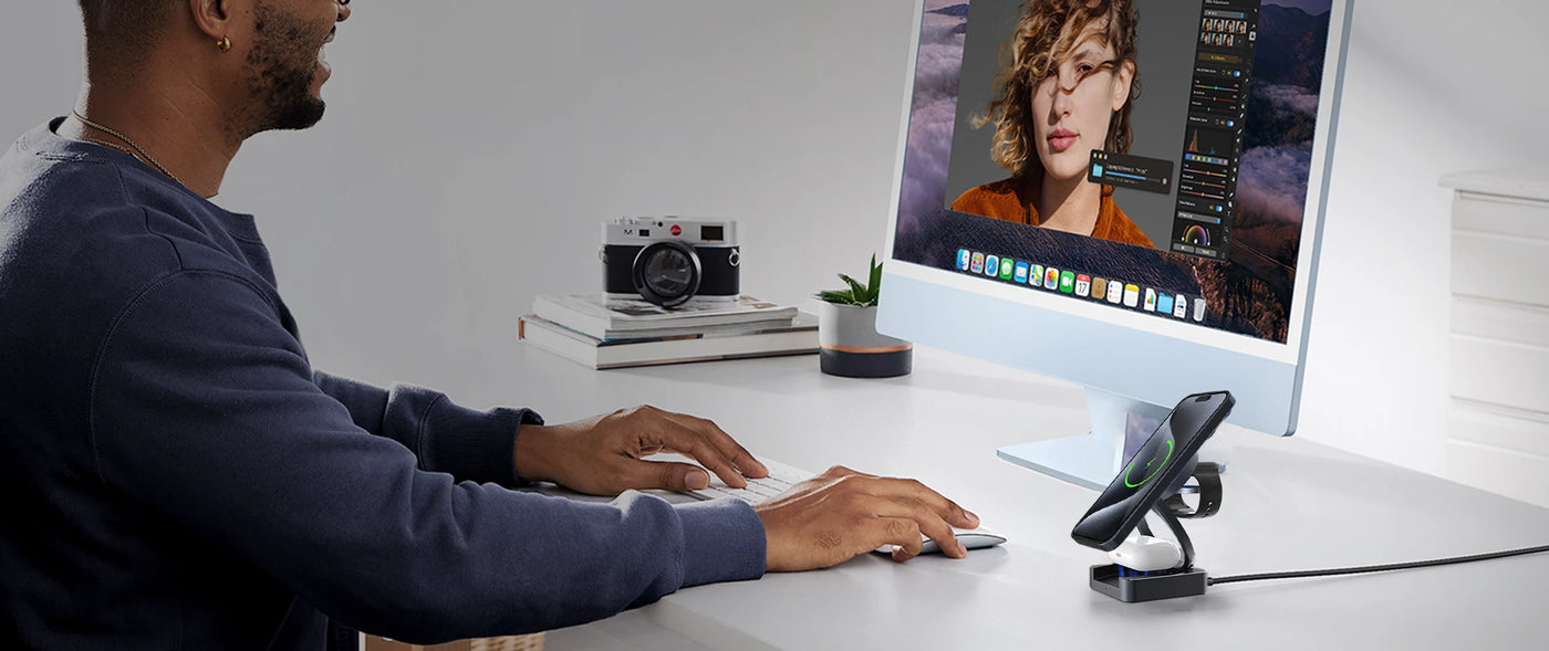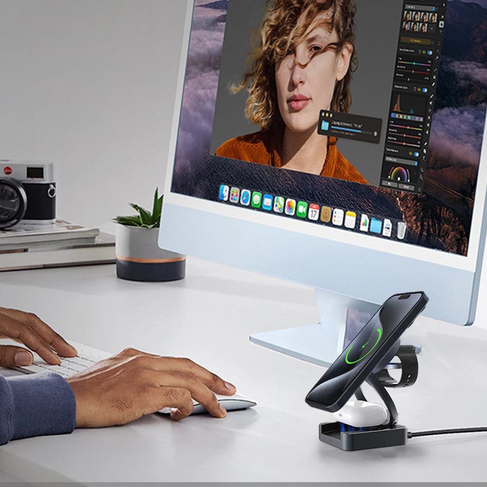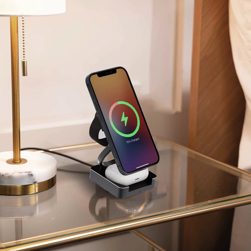 • Introducing the MagFold Trio 3-in-1 Wireless Charger—a must-have for iPhone, Apple Watch, and AirPods users seeking convenience and efficiency. This sleek, foldable charging station powers all your Apple devices simultaneously. Featuring magnetic fast charging, it ensures quicker and more stable charging. Its minimalist design transforms your workspace into an organized and stylish environment. Perfect for travel, the foldable design makes it incredibly portable, so you can enjoy seamless charging wherever you go. Upgrade your charging experience with the MagFold Trio 3-in-1 Wireless Charger and simplify your life with this all-in-one, efficient solution.