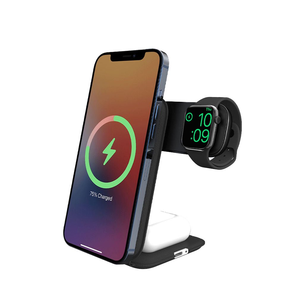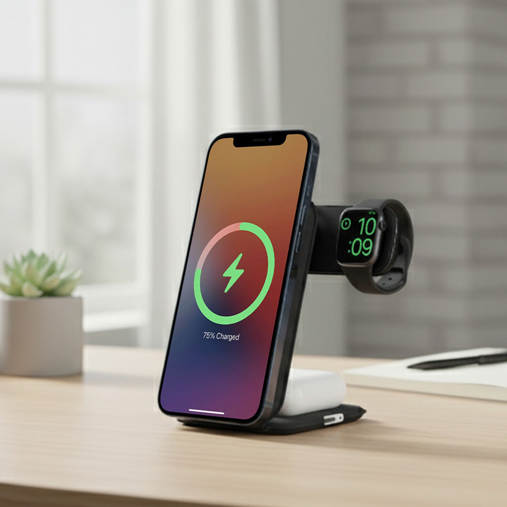 The OmniLynx 3-in-1 Foldable MagSafe Charger combines ultimate portability with powerful performance. Featuring a compact, foldable design with strong N52H magnets, it securely holds your devices and adjusts with a 180° stainless steel pivot. With upgraded 23.5W fast charging, it powers up your phone 65% in just 30 minutes, all while multiple safety certifications ensure complete protection. It's the sleek, two-device charging solution for any situation.