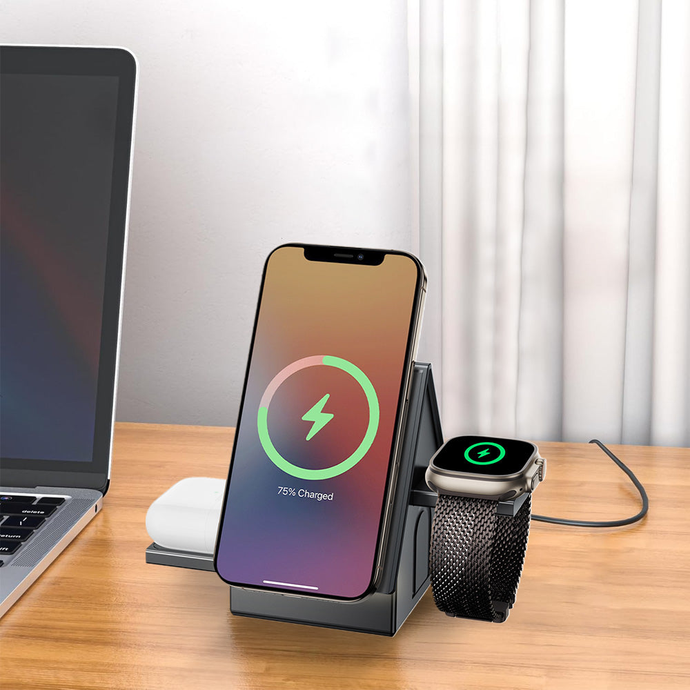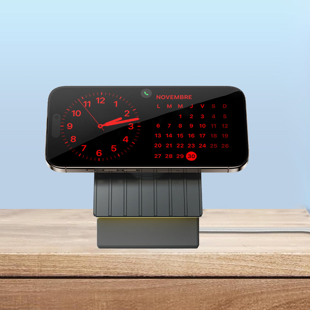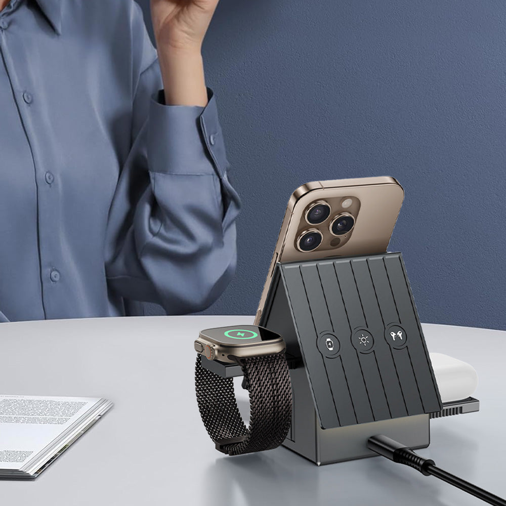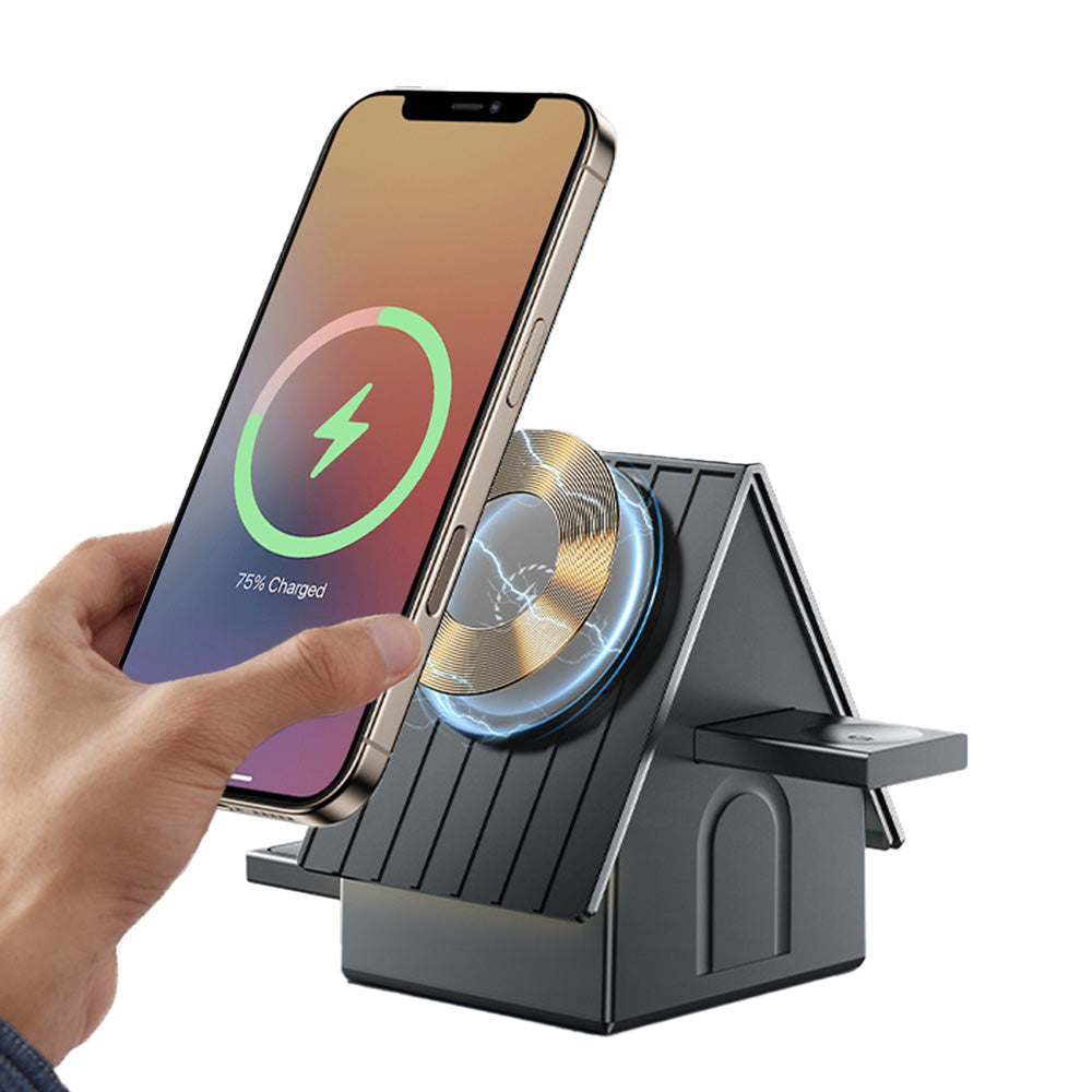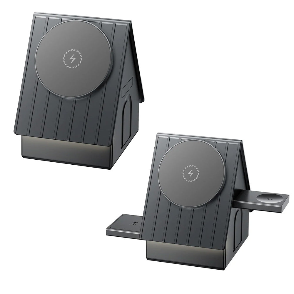 Meet the UniDock Sense 3-in-1 MagSafe Wireless Charger. This innovative "little house" features fully automatic touch controls to reveal hidden charging bays for your Apple Watch and Airpods. Supports 15W fast charging for your iPhone, plus simultaneous charging for your Apple Watch and Airpods. Enjoy strong magnetic alignment, an adjustable stand for horizontal or vertical viewing, and thoughtful details like warm white indicator lights and non-slip pads. It simplifies your charging setup with style and efficiency.
