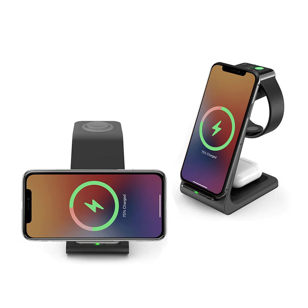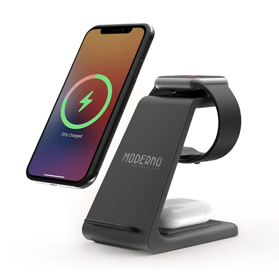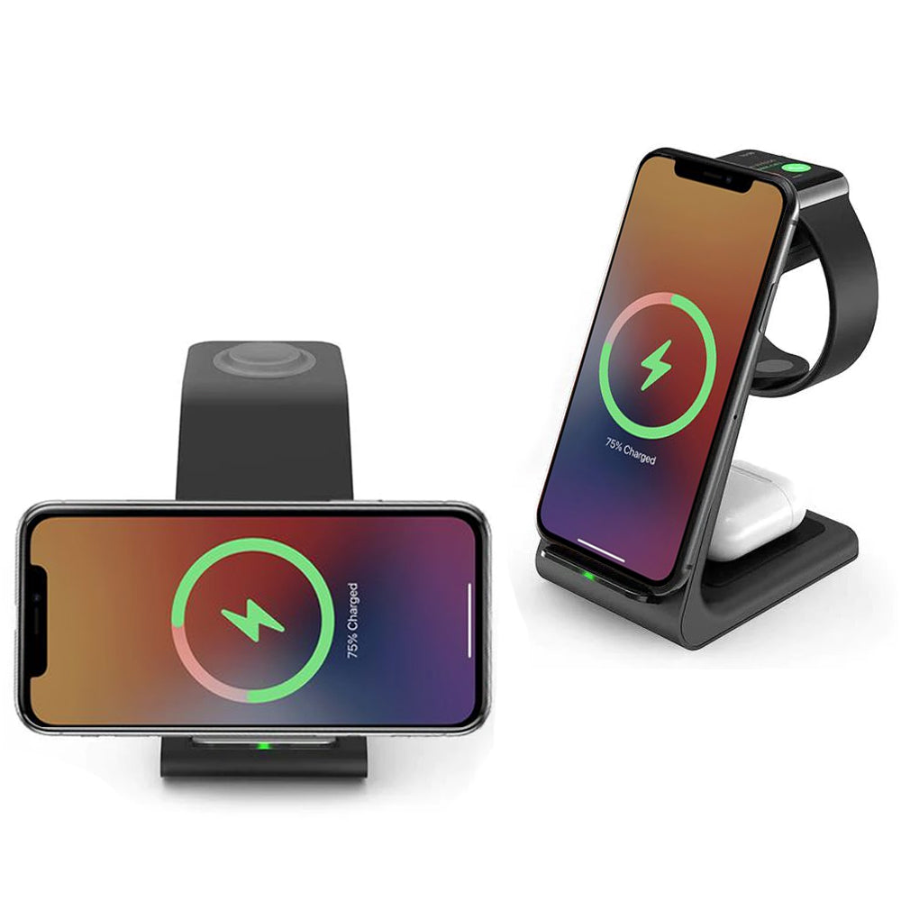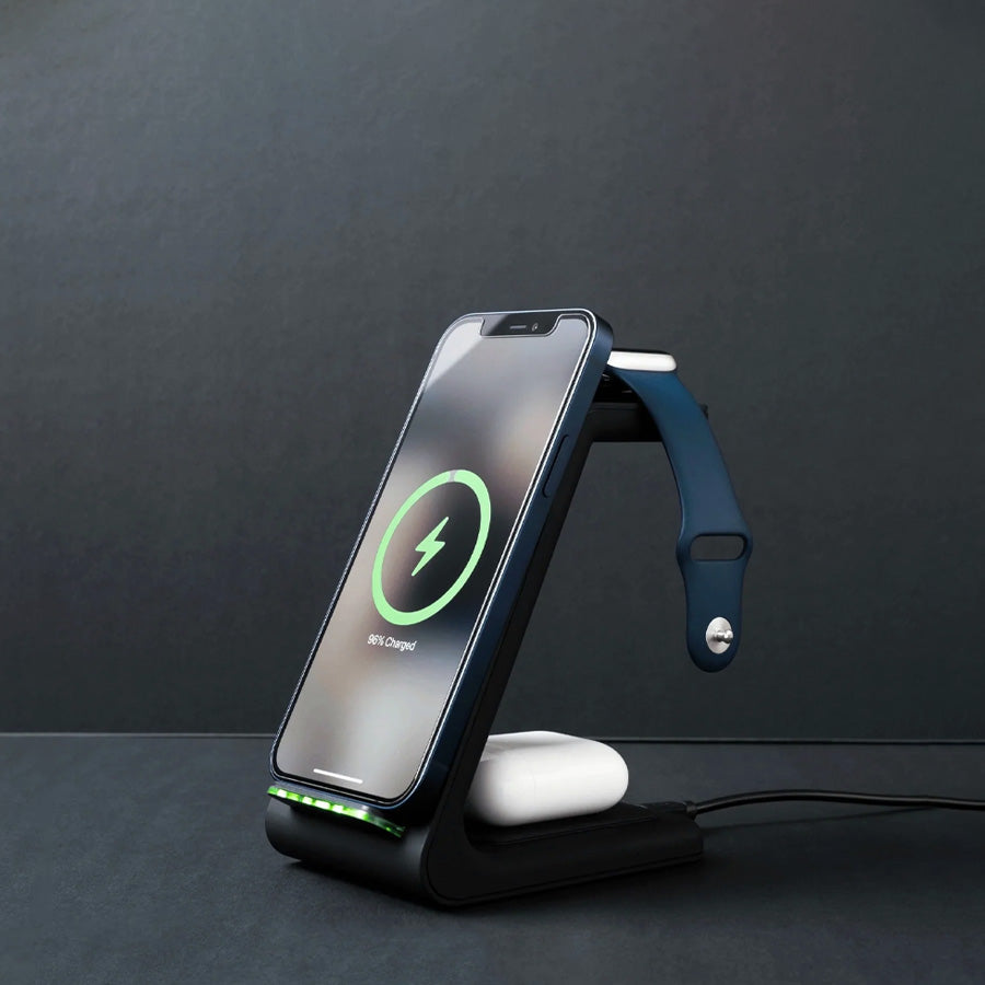 • Plugging and unplugging devices can be such a hassle; it doesn't have to be that way. The Premium 3 in 1 Wireless Charging Stand is designed to fuel your iPhone, Apple Watch, and AirPods batteries simultaneously quickly. The small base fits just about anywhere.