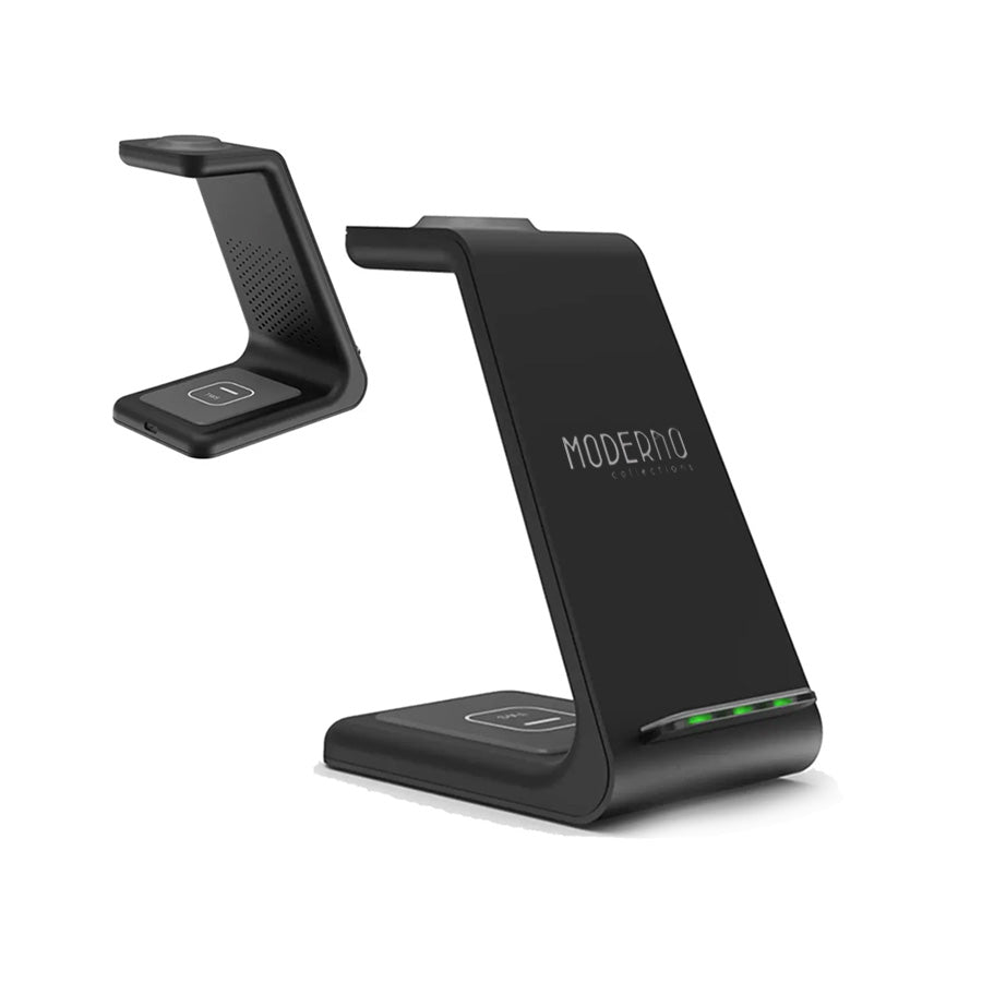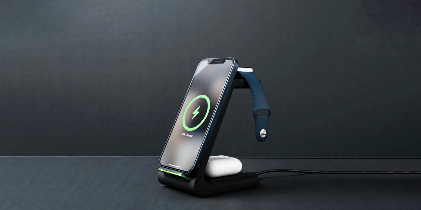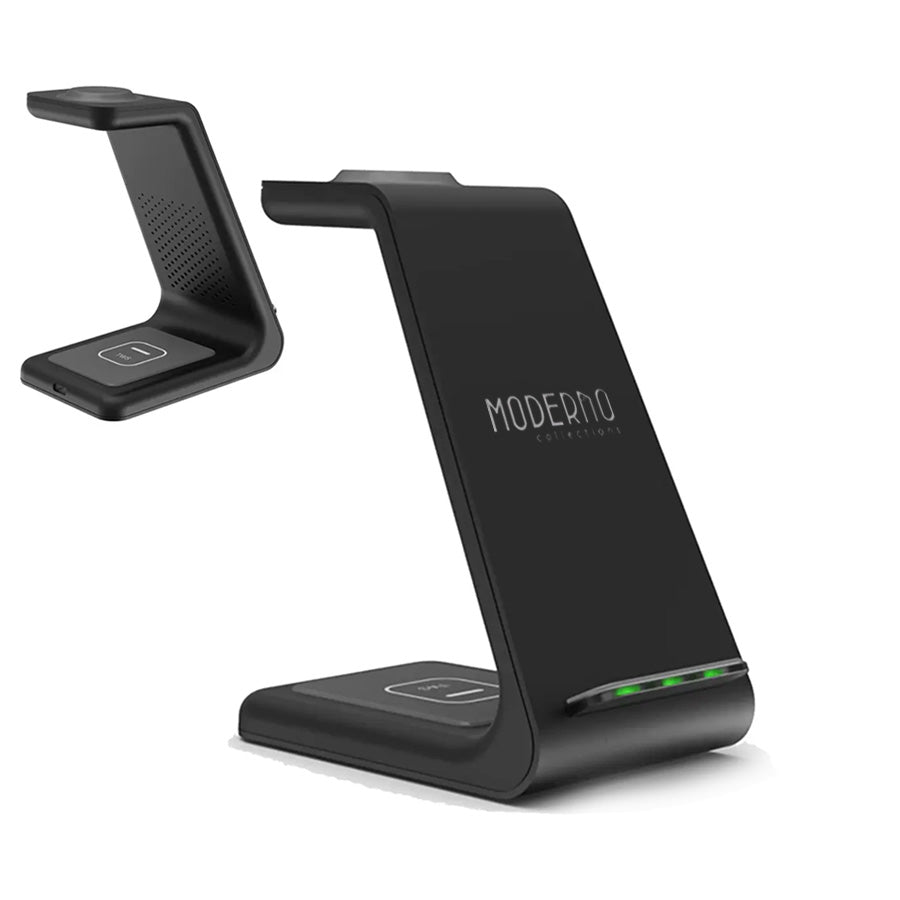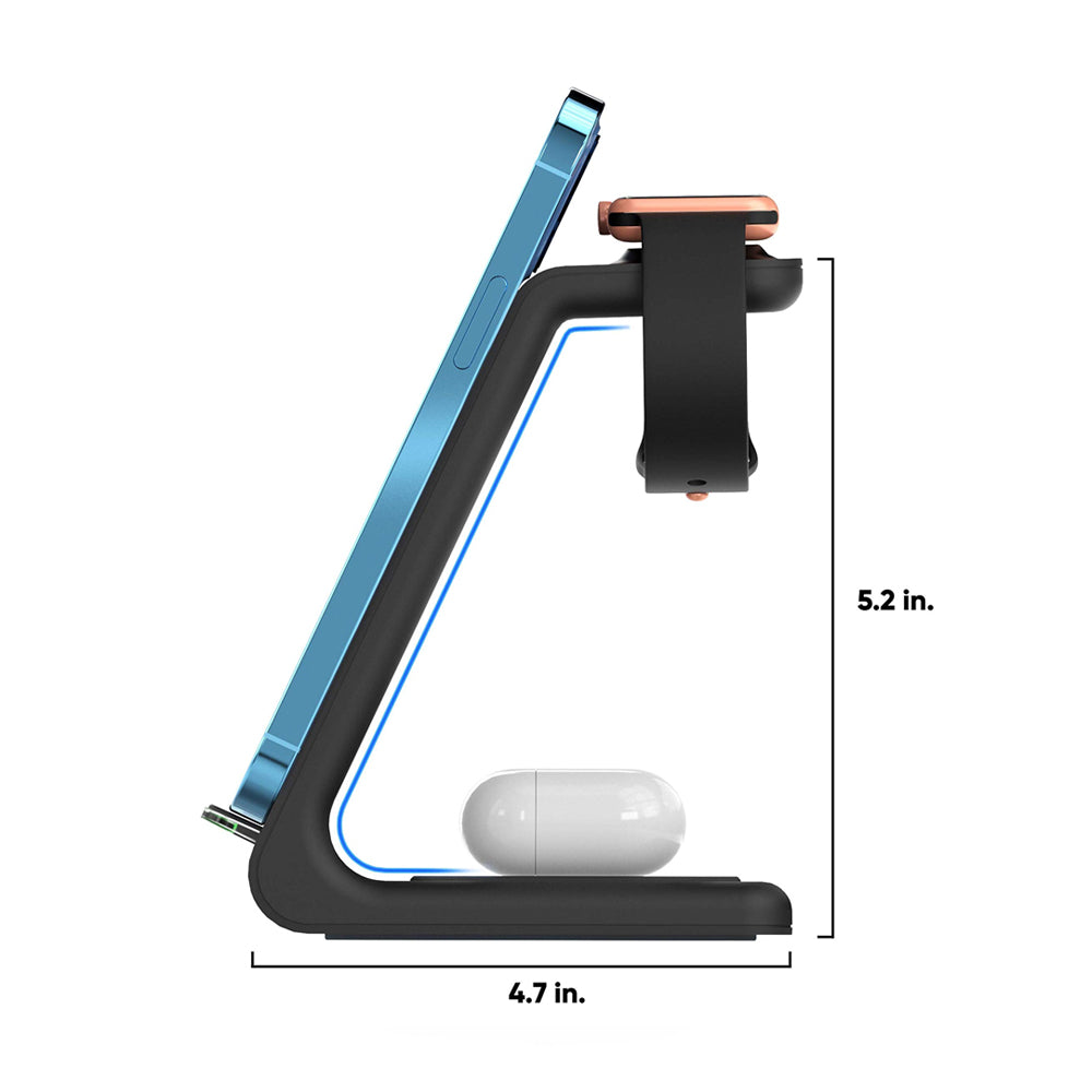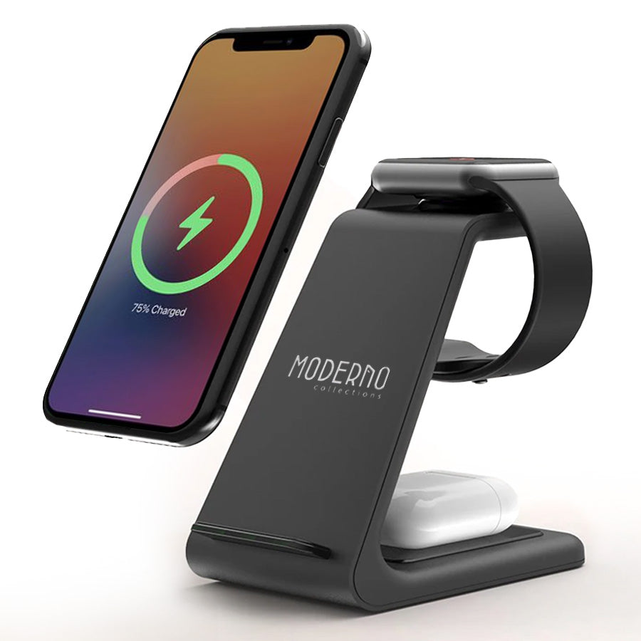 • Plugging and unplugging devices can be such a hassle; it doesn't have to be that way. The Premium 3 in 1 Wireless Charging Stand is designed to fuel your iPhone, Apple Watch, and AirPods batteries simultaneously quickly. The small base fits just about anywhere.